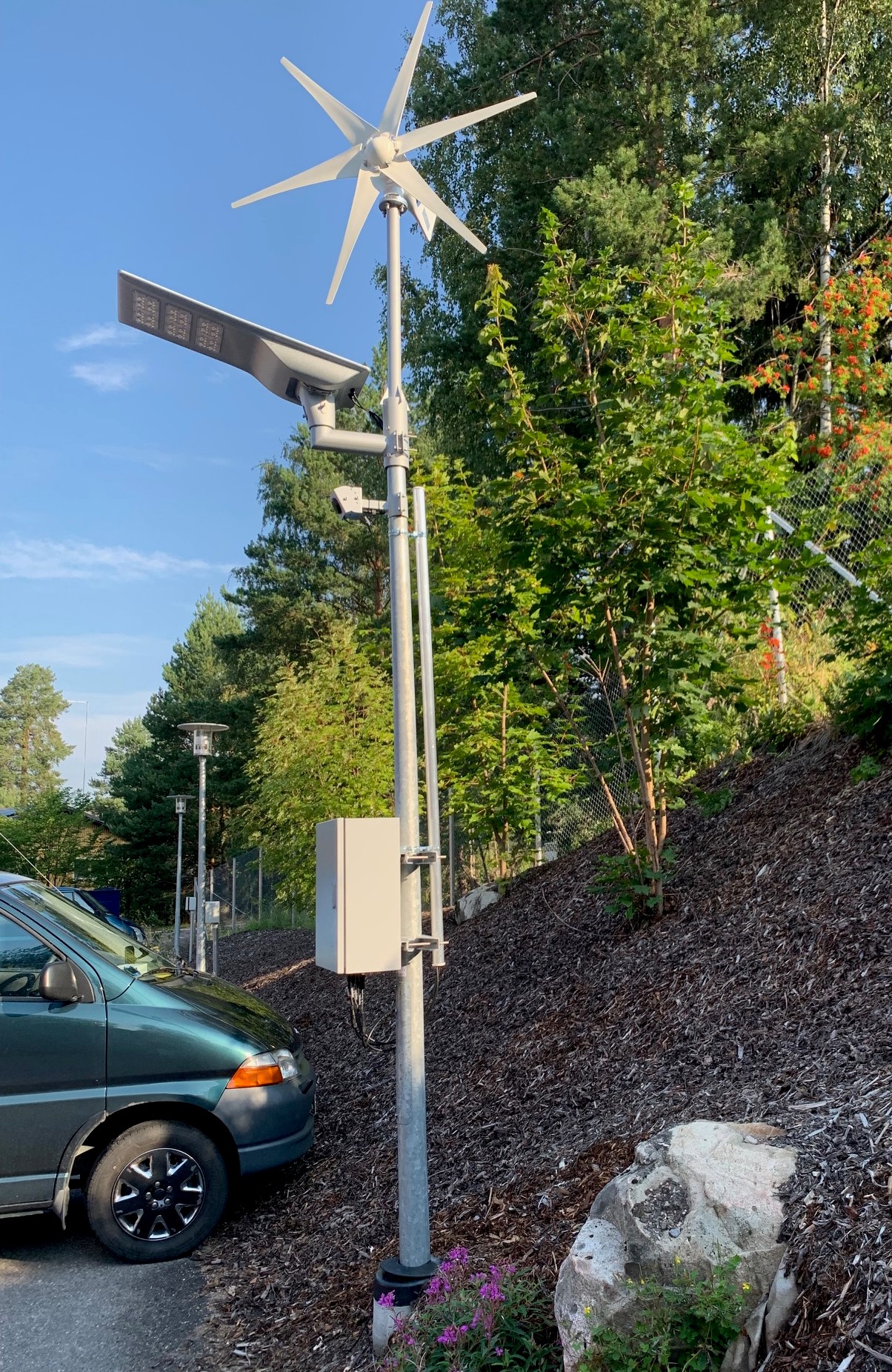 Täysin omavoimainen aurinkokenno / tuuligeneraattori hybridi valaisin, tämä takaa täyden 100% energiansäästön täysin puhtaalla päästöttömällä