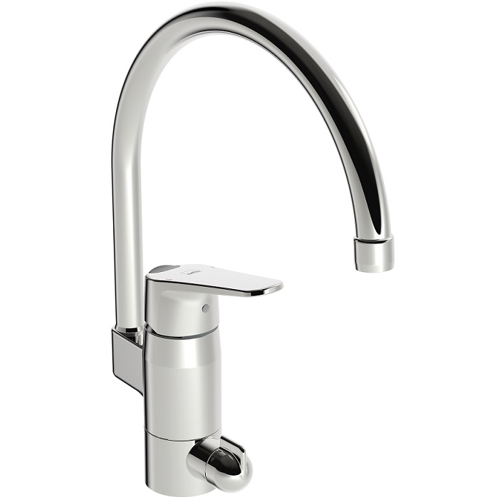 Keittiöhana jossa pesukoneventtiili ja korkea, kääntyvä juoksuputki 120° (voidaan rajoittaa 0° tai 60°). Pesukoneventtiilissä keraaminen käyttöventtiili (90° auki-kiinni). Hanan vivussa on veden virtaamaa rajoittava ekonappi.