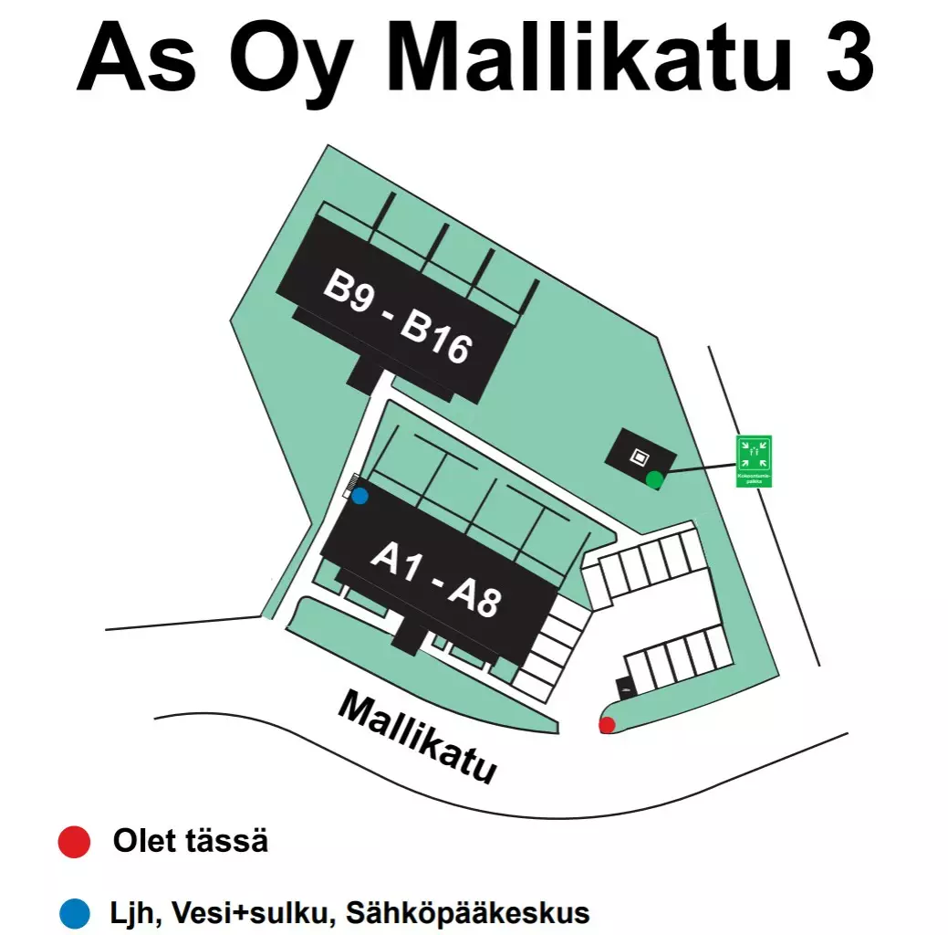 perille. Alueopastekarttaan voidaan rakennusten, rappujen ja pihateiden lisäksi merkitä vieraspysäköintipaikat, pelastustiet / ambulanssireitit, väestönsuojat, IV- ja vesisulut yms. kiinteistössä olevat tärkeät paikat.