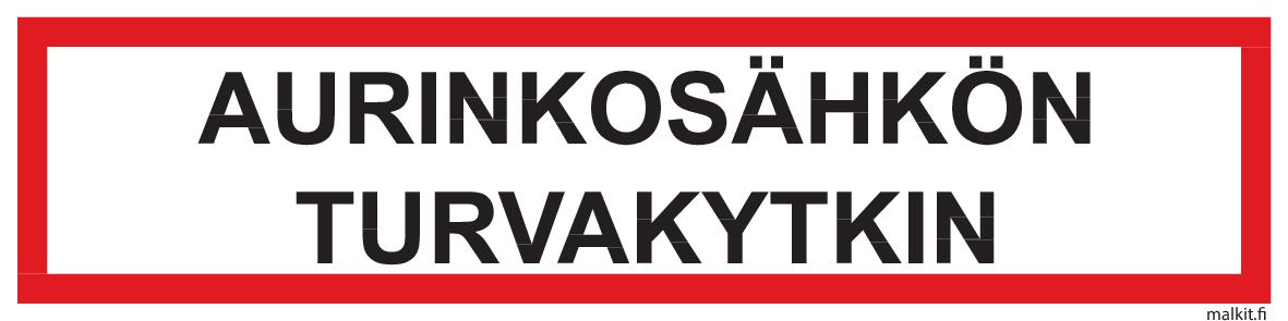 Paloalan opaste Aurinkosähkön turvakytkin. Valkoinen pohja, punainen reuna ja musta teksti. Koko ja materiaalit : 200 x 50 mm 400 x 100 mm Tarra, muovi, alumiini