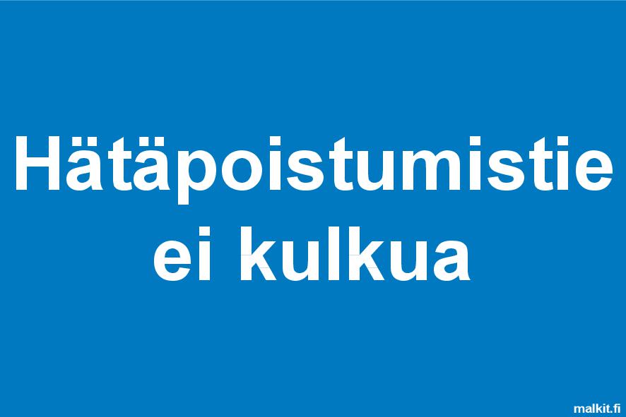 Hätäpoistumistie ei kulkua.Sininen pohja, valkoinen teksti. Ei kehystä.