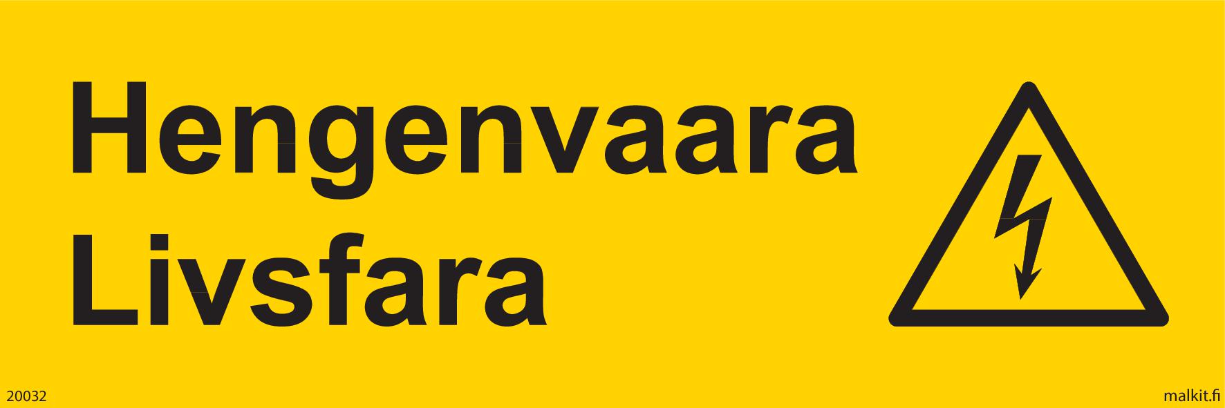 Sähköalan opaste Hengenvaara-Livsfara. Keltainen pohja, musta symboli ja teksti. Koot: 100 x 40 mm 200 x 80 mm 300 x 120 mm 400 x 150 mm 500 x 200 mm 600 x 250 mm Materiaalit: Tarra, muovi, alumiini... Lue lisää