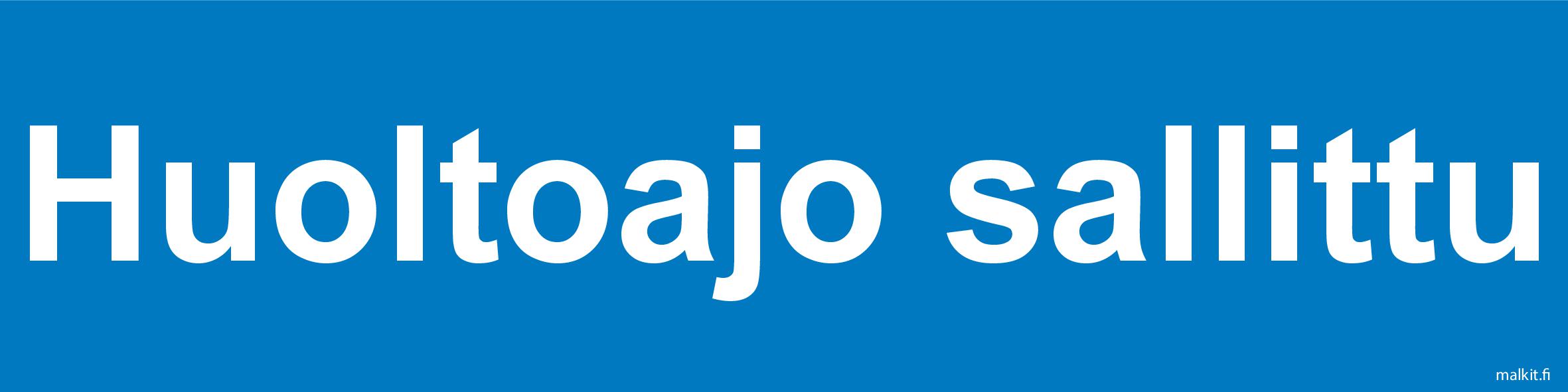 Kiinteistöopaste Huoltoajo sallittu. Sininen pohja, valkoinen teksti. Koot: 75 x 30 mm 100 x 40 mm 200 x 50 mm 300 x 80 mm 400 x 100 mm 500 x 120 mm 600 x 150 mm Materiaalit: Tarra, muovi, alumiini... Lue lisää