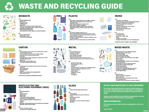 Englanninkielinen jätelajitteluohje jätteiden keräyspaikalle esim. taloyhtiön jätekatokseet tai jätehuoneeseen. Kiinnitys seinään.