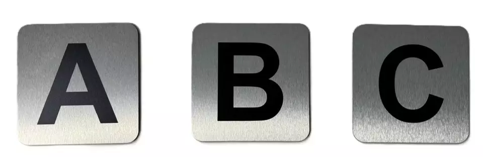 Kirjain opaste. Pohja harjattu alumiini, musta kirjain. Pyöristetyt kulmat.
