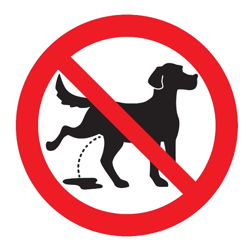 Kieltokilpi Koirien ulkoiluttaminen kielletty pissaava koira symbolilla. Valkoinen pohja, puna-musta symboli.
