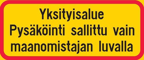 Liikennemerkin lisäkilpi Yksityisalue Pysäköinti sallittu vain maanomistajan luvalla. Keltainen pohja, musta teksti ja punainen reuna.