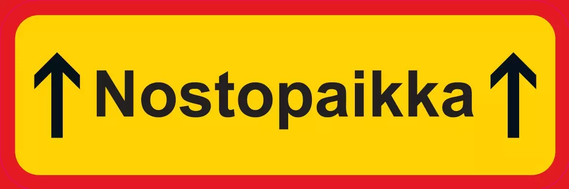 Liikennemerkin lisäkilpi Nostopaikka + nuolet ylös. Keltainen pohja, musta teksti ja punainen reuna. Lisäkilvessä käytetään saman heijastavuusluokan kalvoa kuin sen päämerkissä.... Lue lisää