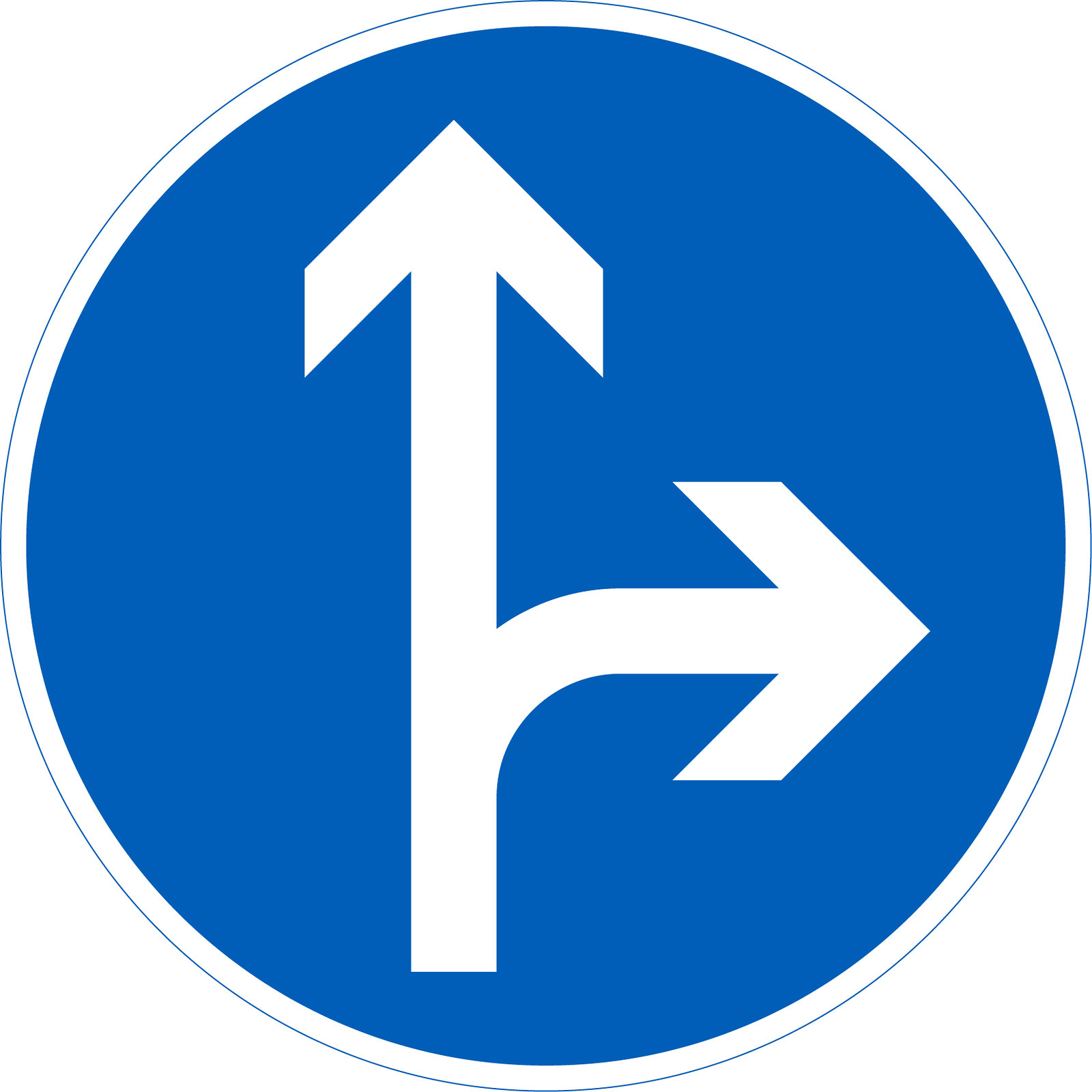 Liikennemerkki D1.6 Pakollinen ajosuunta. Sininen pohja, valkoinen symboli ja reuna. Merkillä osoitetaan ajoneuvolle sallitut ajosuunnat risteyksessä. Merkkien nuolikuvioita voidaan muuttaa... Lue lisää