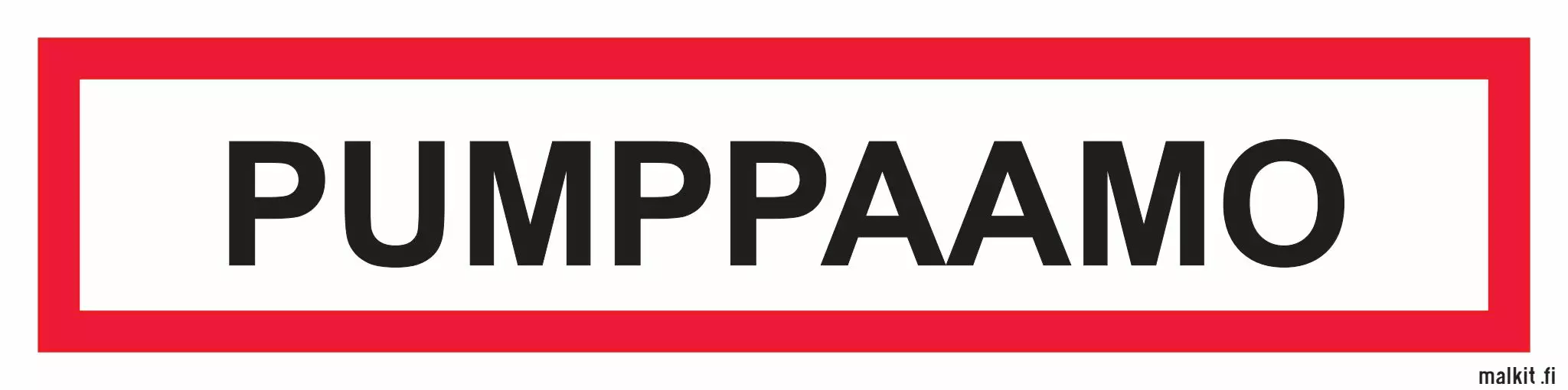 Paloalan opaste PUMPPAAMO. Valkoinen pohja, punainen reuna ja musta teksti. Koot ja materiaalit : 200 x 50 mm 300 x 80 mm 400 x 100 mm 500 x 120 mm 600 x 150 mm Tarra, muovi, alumiini... Lue lisää