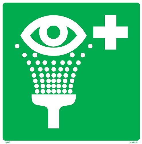 Ensiapuopaste Silmänhuuhtelu. Vihreä pohja, valkoinen symboli. Jälkivalaisevassa opasteessa symboli ja reunus hohtavat pimeässä. Koot: 100 x 100 mm 150 x 150 mm 200 x 200 mm 250 x 250 mm 300 x... Lue lisää