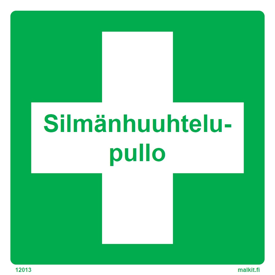 Ensiapuopaste Silmänhuuhtelupullo. Vihreä pohja, valkoinen symboli, jossa vihreä teksti. Koot: 100 x 100 mm 150 x 150 mm 200 x 200 mm 250 x 250 mm 300 x 300 mm 350 x 350 mm Materiaalit: Tarra... Lue lisää