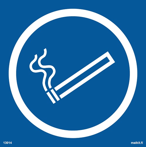 Ohjekilpi Tupakointi sallittu. Sininen pohja, valkoinen teksti ja symboli