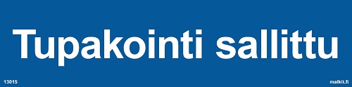 Ohjekilpi Tupakointi sallittu. Sininen pohja, valkoinen teksti. Koot: 100 x 25 mm 150 x 40 mm 200 x 50 mm 300 x 80 mm 400 x 100 mm 500 x 120 mm 600 x 150 mm Materiaalit: Tarra, muovi, alumiini... Lue lisää