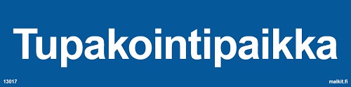 Ohjekilpi Tupakkointipaikka. Sininen pohja, valkoinen teksti.