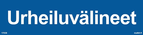 Kiinteistöopaste Urheiluvälineet. Sininen pohja, valkoinen teksti. Koko: 75 x 30 mm 100 x 40 mm 200 x 50 mm 300 x 80 mm 400 x 100 mm 500 x 120 mm 600 x 150 mm Materiaalit: Tarra, muovi, alumiini... Lue lisää
