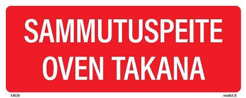Paloalan opaste Sammutuspeite oven takana. Punainen pohja, valkoinen teksti ja kehys. Jälkivalaisevassa kyltissä teksti ja kehys hohtavat pimeässä. Koot: 100 x 40 mm 200 x 80 mm 250 x 100 mm 300 x... Lue lisää