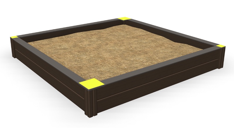 Selkeälinjainen puurakenteinen hiekkalaatikko, joka on 2495 mm x 2495 mm. Hiekkalaatikon reunat ovat leveät, jolloin niillä voidaan myös tasapainoilla ja
