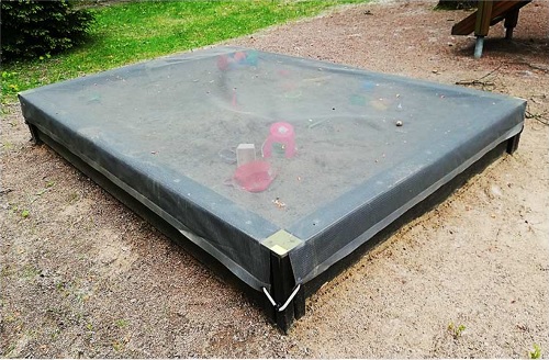 Hiekkalaatikon suojapeite on hienosilmäistä vettä läpäisevää harmaata PVC-verkkoa. Materiaali on palo- ja home-suojattua PVC / polyester verkkoa. Reunoissa on 4 cm PVC vahvistusnauha. Hiekkalaatikon suojapeite estää