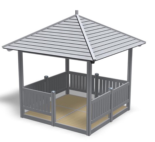 Nelikulmainen huvimaja, joka suojaa niin auringolta kuin sateelta.