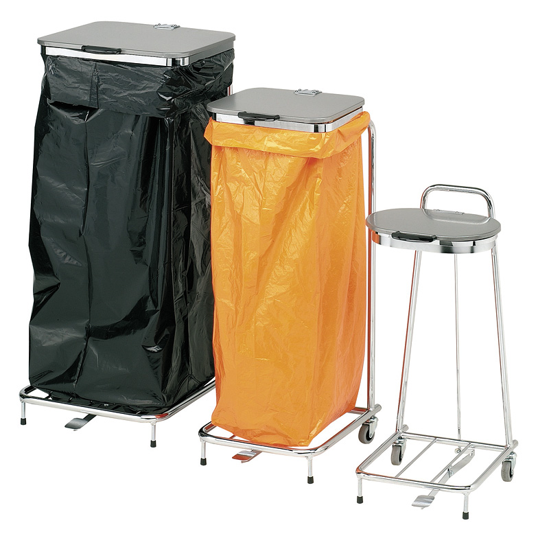 Erittäin käytännöllinen polkimella avautuva, kannellinen jätesäkkiteline 100 - 150 L jätesäkille. Sopii käytettäväksi esim. kaupoissa tai teollisuudessa. Tukeva, kromattu teräsrunko... Lue lisää