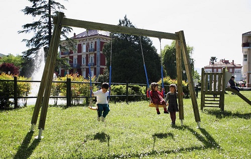Clover-sarjaan kuuluva keinuteline kahdelle istuimelle jonka korkeus on 2290 mm. Istuinten ketjut 160 cm. Perustus vaatii betonoinnin.