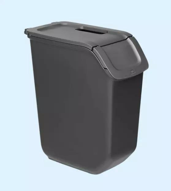 päällä on toinen astia. Astiassa on roskapussille pidikkeet. Astian kansi pysyy auki, jolloin astiaa on helppo täyttää, kantaa ja tyhjentää.