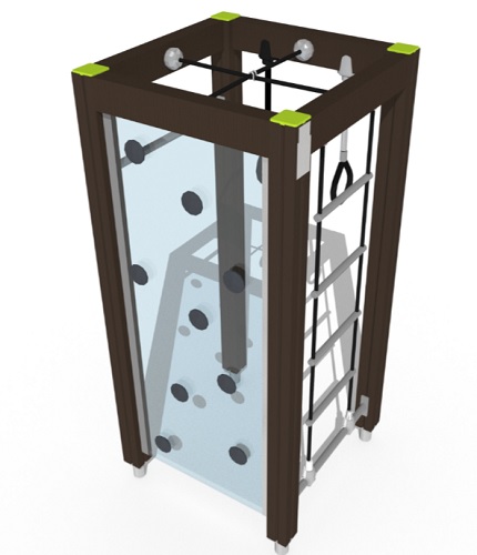 Pienen tilan kiipeilyteline monipuolisilla toiminnoilla. Ulkomitoiltaan (0,89 x 0,90 m) pieneen kiipeilytelineeseen on saatu 5 erilaista kiipeilyelementtiä