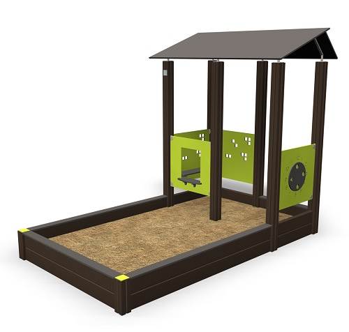Leikkivälineeseen kuuluu hiekkalaatikko ja maja, jossa on harjakatto. Selkeälinjainen puurakenteinen hiekkalaatikko on 1900 mm x 2920 mm. Hiekkalaatikon reunat ovat leveät, jolloin niillä voidaan myös tasapainoilla ja aikuisilla on