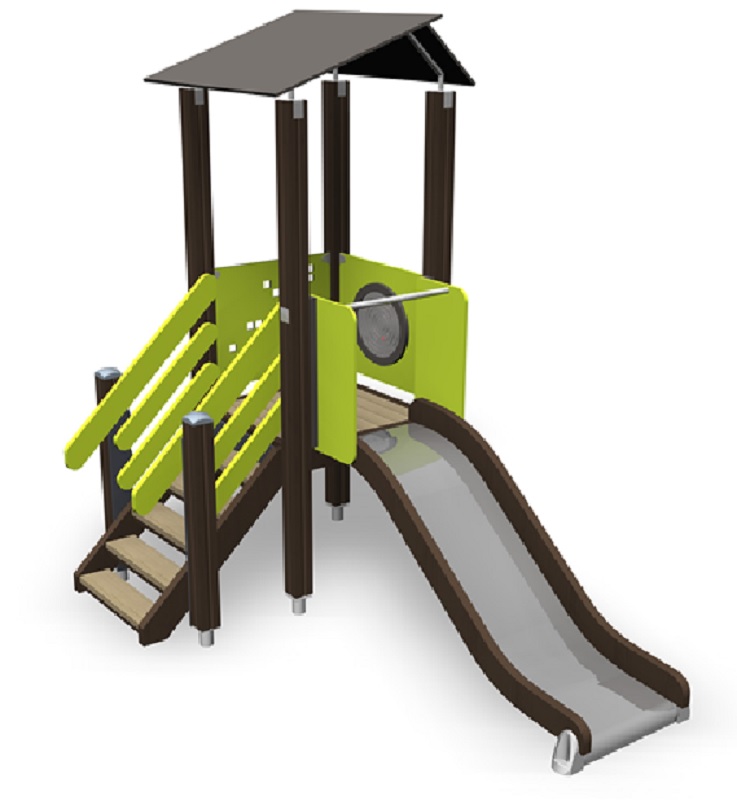 Leikkiväline, jossa on portaat 870 mm korkealle tasanteelle sekä pieni liukumäki. Tasanteella on rulettiseinä. Harjakatto. Seinät ovat kauniisti kuvioitua