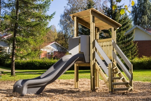 Liukumäessä on portaat 870 mm korkealle katolliselle tasanteelle sekä pieni liukumäki. Kaiteet kestävää HPL-laminaattia. Liukuosa muovia.