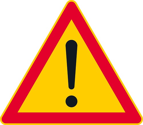 Liikennemerkki A33 Muu vaara. Keltainen pohja, punainen reuna, musta symboli.