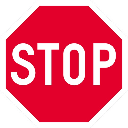 Liikennemerkki B6 Pakollinen pysäyttäminen. Punainen pohja, valkoinen teksti ja reuna.