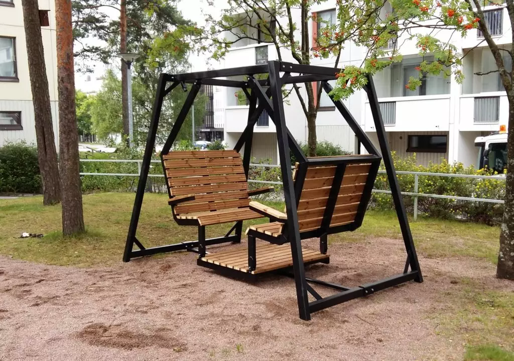 Tämä keinu kestää ja on turvallinen. Keinun heilurirakenne on toteutettu perinteistä puista keinua yksinkertaisemmin.