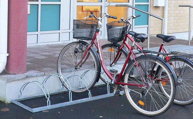 Vierekkäiset telinekaaret on kehikossa vinosti oikealle ja asennettuna eri korkeuksilla helpottaen polkupyörän pysäköintiä.