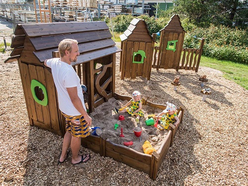 Jännittävä Rantamaja on rakennettu hiekkalaatikon päätyyn, eli leikit voivat jatkua ”sisältä ulos” ja takaisin. Tässä tuotteessa leikitään sateella ja