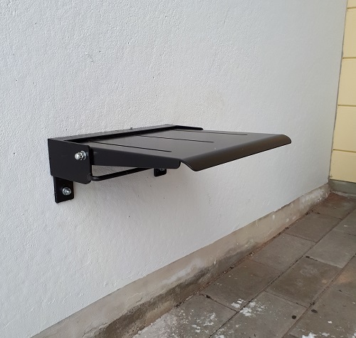Seinään kiinnitettävä metallinen istuin, joka nousee automaattisesti seinää vasten, kun siinä ei istuta. Materiaali pulverimaalattua terästä. Soveltuu