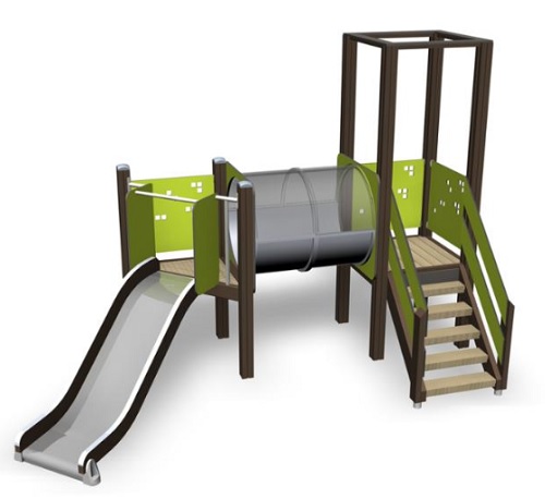 Leikkiväline, jossa on portaat matalalle tasanteelle, tunneli sekä pieni liukumäki. 870 mm korkeudella olevaan liukumäkeen pääsee turvallisesti portaita ja