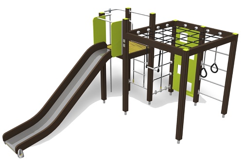 Monipuolinen isommille lapsille suunnattu leikkiväline, josta löytyy sekä liukumäki, että kiipeilyteline. Köysitikkaita noustaan torniin, joka on 1470 mm