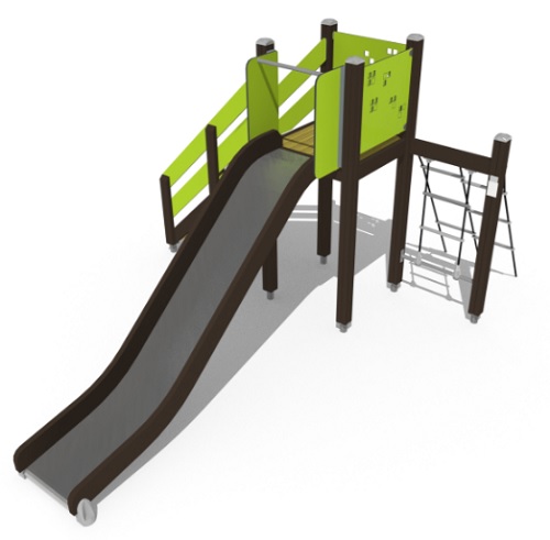 Liukumäen ja pienen kiipeilytelineen yhdistelmä. 1,47 m korkean liukumäen vieressä on köysitikkaat ja puolakiipeilyverkko. Liukumäkeen johtaa portaat.