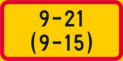 Liikennemerkin lisäkilpi H17.1_2a Voimassaoloaika. Keltainen pohja, musta symboli ja punainen reuna. Lisäkilvellä osoitetaan liikennemerkin voimassaoloaikaa. H17.1_2 Arkipäivä maanantaista... Lue lisää