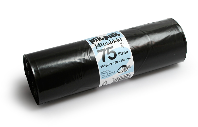 Musta 75 L jätesäkki. Koko: 750 x 750 x 0,04 mm Pakkauskoot: 20 kpl / rll 15 rll / ltk, 480 rll / lava (32 ltk)