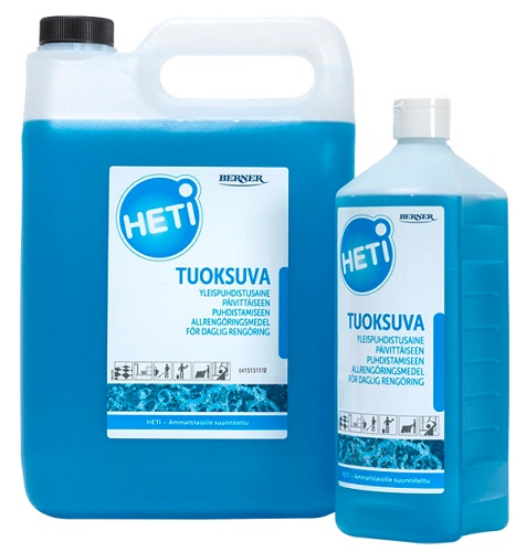 HETI Tuoksuvalla voidaan suorittaa kaikkien vettä sietävien pintojen päivittäinen puhdistus. Tehokkaana puhdistusaineena HETI Tuoksuva soveltuu lisäksi pinttyneen ja rasvalian poistoon myös yhdistelmäkoneessa. Tuotteessa on