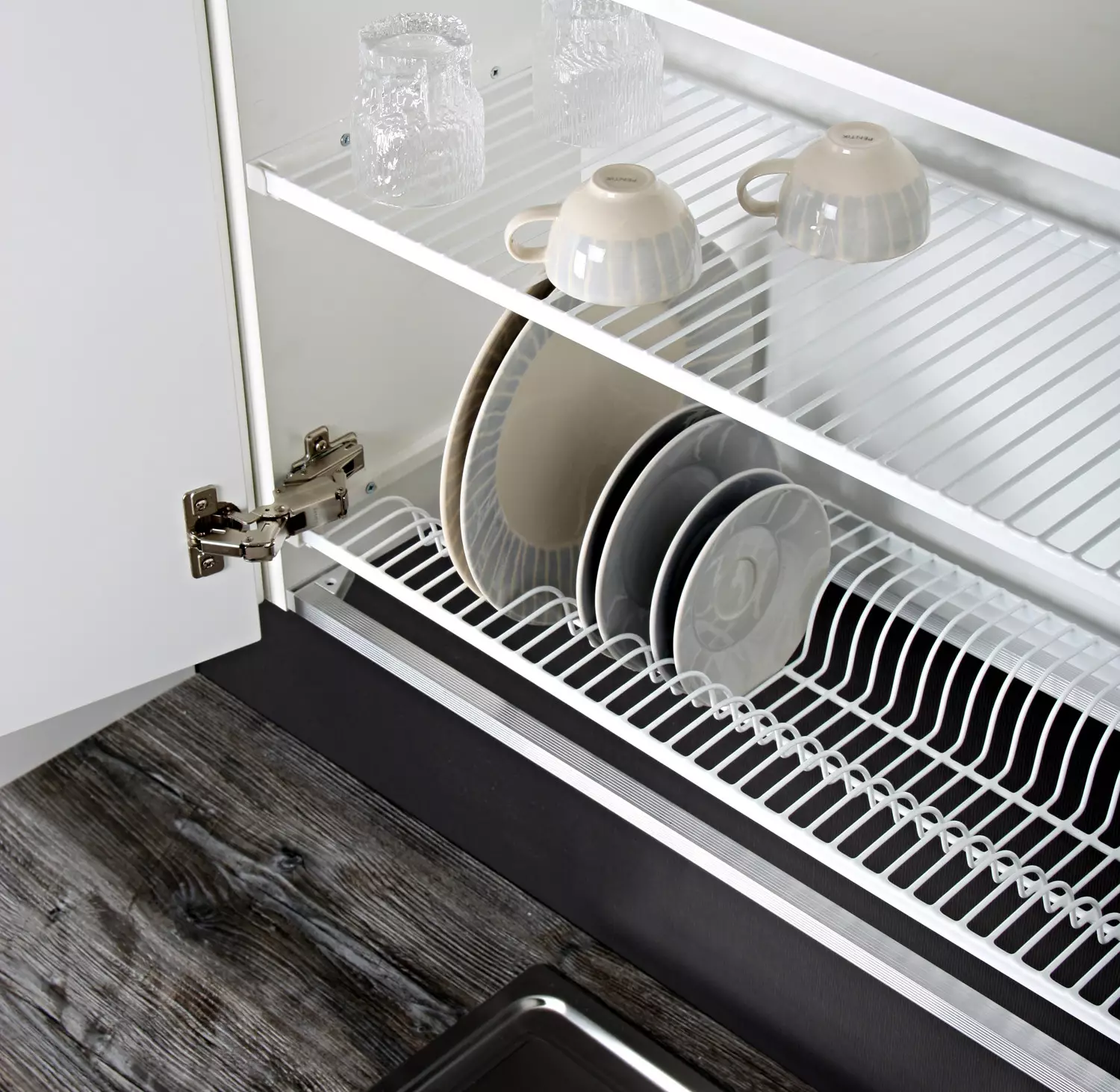 Tukeva tasohylly keittiökaappiin astioiden kuivaukseen.