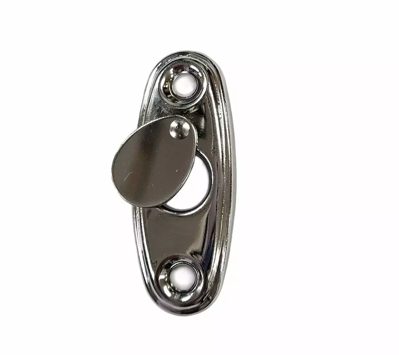 Ovaali ikkunakilpi metallisella vedonestoläpällä Materiaali teräs, kromattu Mitat 59 x 23 mm Reikäväli 42 mm Kiinnitysruuvit ostettava erikseen, esim M5x35SI-17