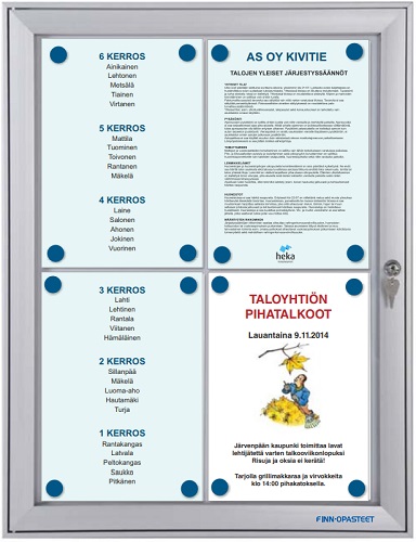 S-sarjan ilmoitustaulut ovat alumiinirakenteensa ansiosta varmoja ratkaisuja aulatiloihin ja rappuihin. Kannen ikkuna on kirkasta akryylia ja taustalevy on terästä. Informaation suojaamiseksi kansi on tiivistetty ohuella silikooninauhalla.