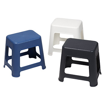 Kotimainen muovijakkara non-slip-liukuesteillä sopii hyvin kylpyhuoneen jakkaraksi. Korkeus 43 cm.