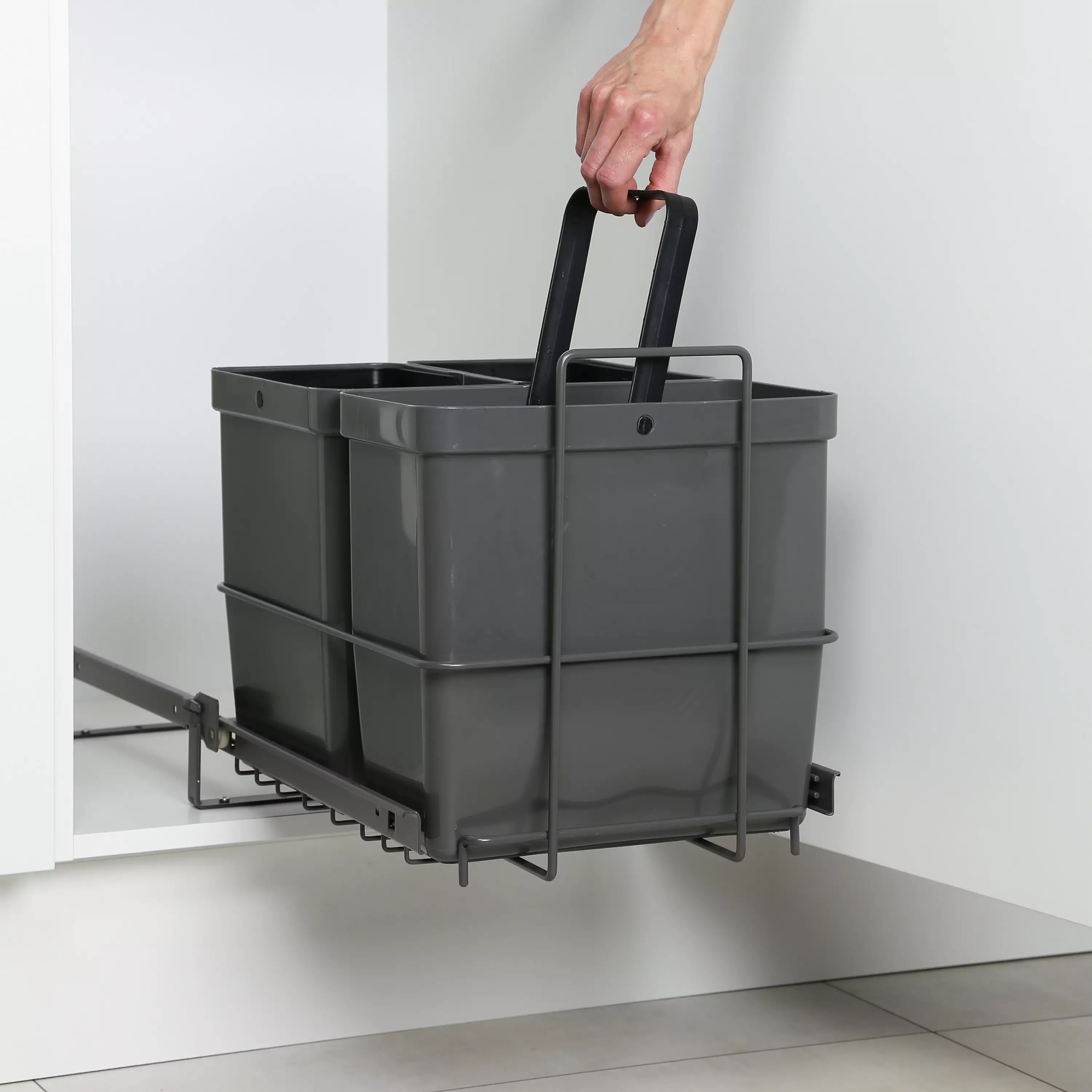 Korkealaatuinen ja kevyesti liukuva jätevaunu pieneen tilaan, lyhyt malli. Tyylikkäästi muotoiltu ja kätevä jätevaunu kolmella sangolla on suunniteltu