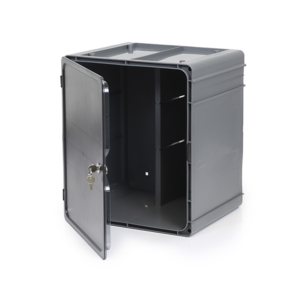 Lukittava kaappi kodin vaarallisille aineille. Väri tumman harmaa / musta. Materiaali muovia. Mitat (LxSxK): 305 x 260 x 356 mm. Ei sisällä hyllyjä eikä koukkuja.