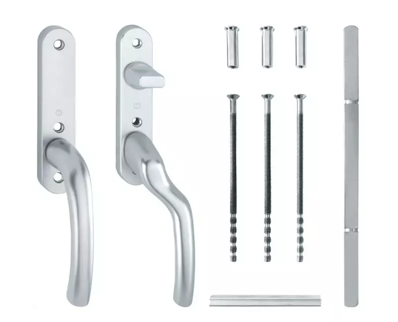 Helapaketti sisältää Tokyo 0710VK/350KL parvekeoven taivutettu painike (oikea) pitkäkilvellä (350KL) ja vääntönupilla (tähtikara 63 mm).